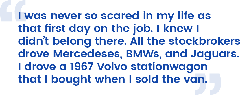 I was never so scared in my life as that first day on the job. I knew I didn’t belong there. All the stockbrokers drove Mercedeses, BMWs, and Jaguars. I drove a 1967 Volvo station wagon that I bought when I sold the van. They parked their cars in the parking lot; for the first six months, I parked my car o n the street because I couldn’t afford the lot. I would get tickets knowing that I’d go to court and ask to work the tickets off with community service. The other brokers would eat out at fancy restaurants after the market closed; I got in my car and went to Taco Bell every single day and ate by myself. Still, I felt so lucky and blessed, for even though I was terrified, I was also excited. Every day I was learning new words and concepts-a