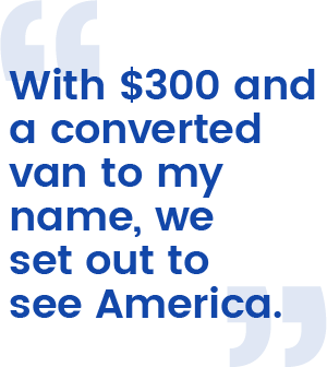 I borrowed $1,500 from my brother to buy a Ford Econoline van and, with the help of my friend Mary Corlin (a great friend to this day), converted the van into a place I could sleep during the drive across country. I CalloutHighwayconvinced three friends-Laurie, Sherry, and Vicky-to come with me; I was way too scared to try this on my own. With $300 and a converted van to my name, we set out to see America.